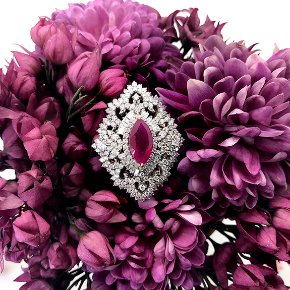 A modern design ring made in diamonds and ruby that is a statement piece you can own for years to come
