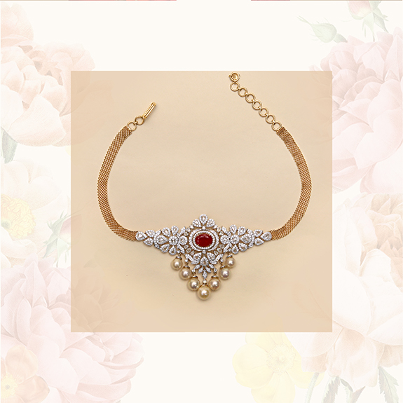 Rose cut and full cut diamonds carefully fit into this armlet, alongside rubies and pearls