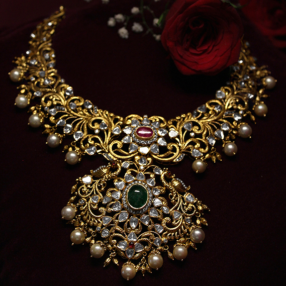 Delicate design depicting vines made in patchi workmanship, studded with polkis, ruby and emerald. Lined with pearls for a grand effect. This necklace is a traditional keepsake for a quintessential Indian bride