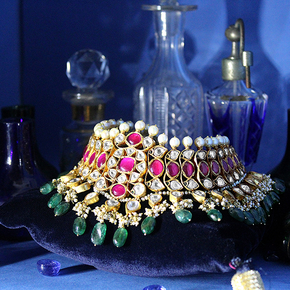 A traditional classic south-Indian choker made in Burmese rubies enrobed in flat diamonds, emeralds and pearls